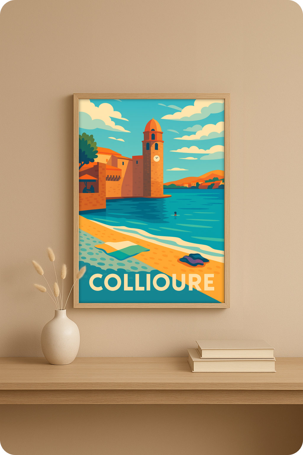 Parce qu’elle capture la lumière et la douceur du Sud, cette affiche de Collioure évoque l’été, la mer et le charme intemporel du littoral méditerranéen.