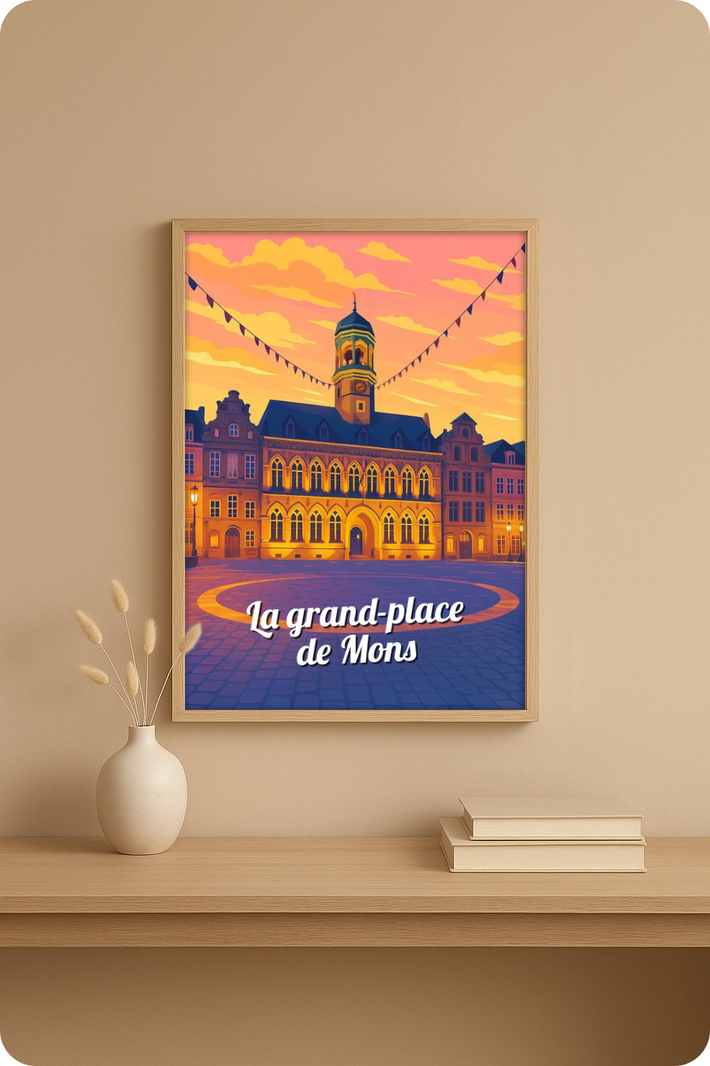 Cœur battant de la ville de Mons, la Grand-Place séduit par son atmosphère conviviale, ses façades historiques et son charme intemporel. Cette affiche design en propose une interprétation artistique et épurée, parfaite pour les amoureux du patrimoine belge et du design minimaliste.