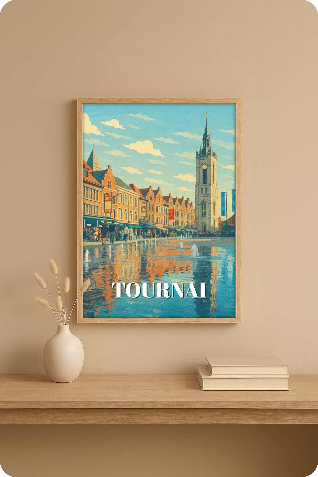 Capturant l’essence du cœur vibrant de la cité des Cinq Clochers, cette affiche design de la Place de Tournai allie patrimoine et modernité dans une composition graphique harmonieuse.